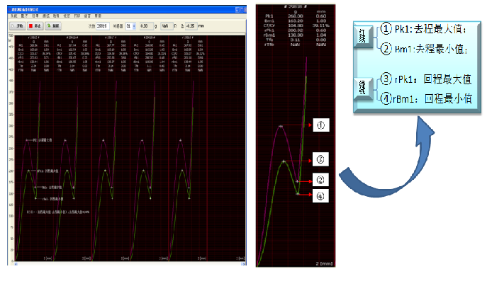 ★ 每一測(cè)量圖形皆可由十字游標(biāo)追蹤軌跡,判別對(duì)應(yīng)之荷重及行程 值,小解析0.01mm;